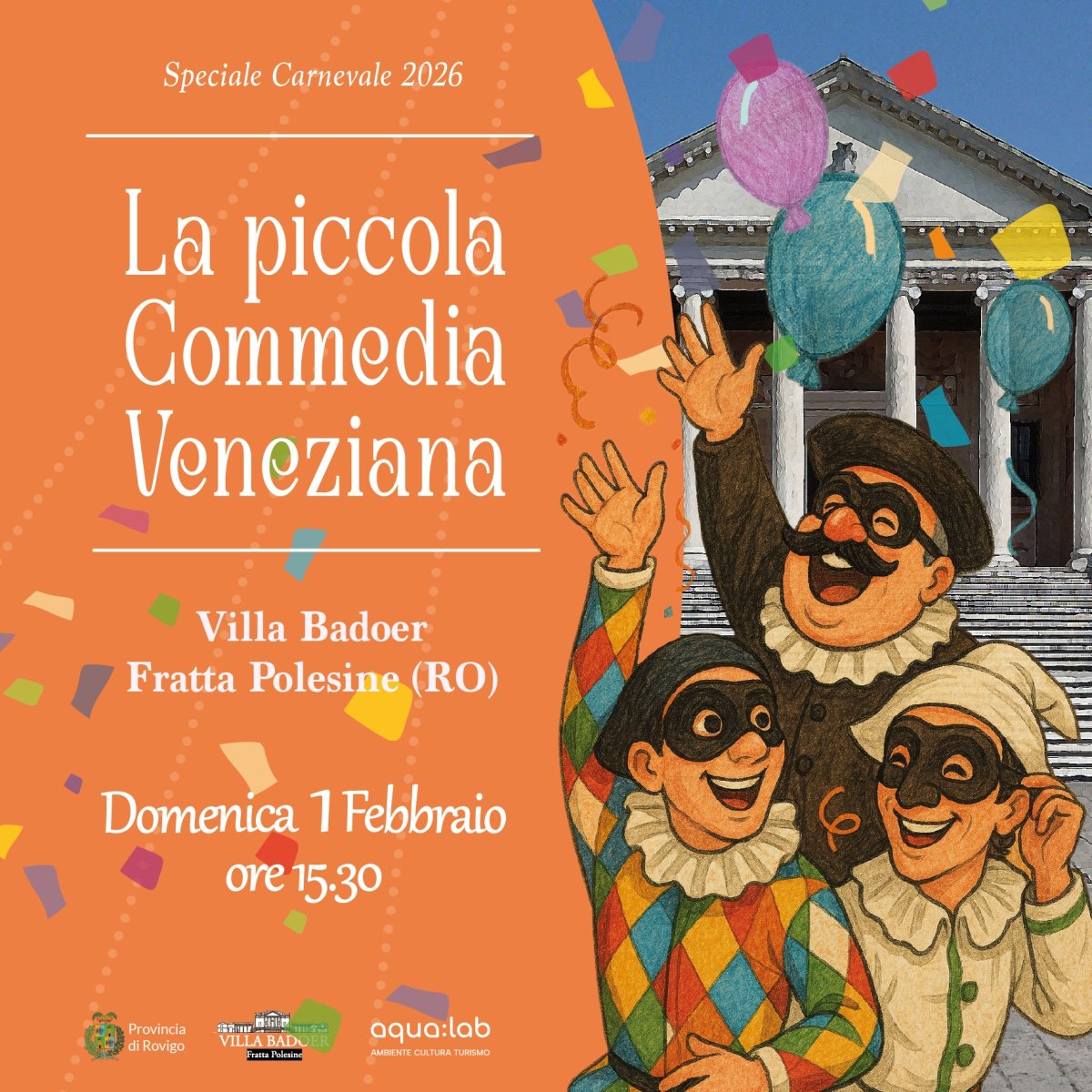 In occasione del Carnevale 2026, la villa apre le sue porte a un mondo incantato fatto di maschere, risate e meraviglia. Tra sale affrescate e spazi da esplorare, i bambini e le loro famiglie saranno accompagnati in un viaggio fantastico nel cuore del Carnevale veneziano. Attraverso giochi teatrali, movimento, voci buffe e tanta creatività, i più piccoli incontreranno i personaggi più amati della Commedia dell’Arte – il furbo Arlecchino, l’elegante Colombina, il saggio Pantalone e il vivace Brighella – imparando a riconoscerli e a interpretarli con gesti, espressioni e piccole improvvisazioni.